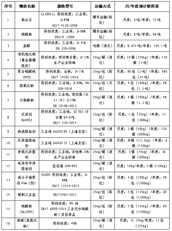 3.標(biāo)的內(nèi)容:熟石灰、碳酸鈉、鹽酸、有機(jī)硫化物(重金屬捕捉劑)、聚合硫酸鐵(PFS)、氫氧化鈉、次氯酸鈉、還原劑NaHSO3、納濾阻垢劑、反滲透阻垢劑、非氧化殺菌劑、電滲析專用阻垢劑、PAM(陰)、精制工業(yè)鹽、硫酸鈉(Na2SO4)(Ⅰ類優(yōu)等品)、液堿(氫氧化鈉)等16種藥品。