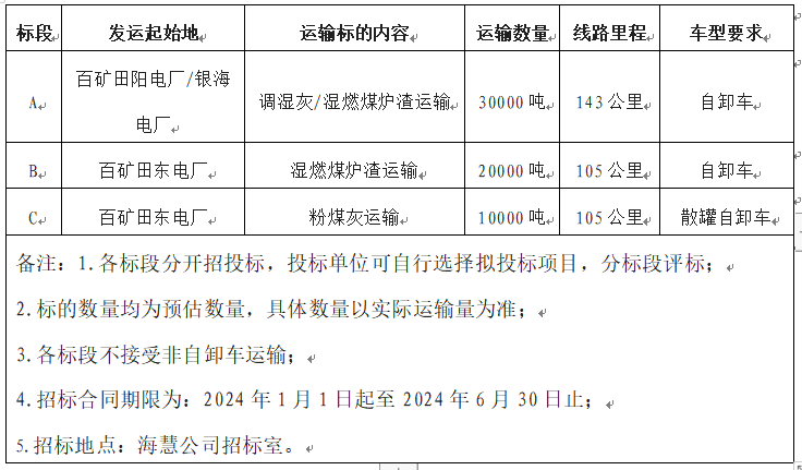 隆安海螺水泥有限責(zé)任公司擬委托安徽海慧供應(yīng)鏈科技有限公司對百礦集團旗下百礦田陽電廠/銀海電廠、田東電廠相關(guān)副產(chǎn)品運輸線路進行公開招標(biāo),選定中標(biāo)人。現(xiàn)將相關(guān)事宜公告如下: