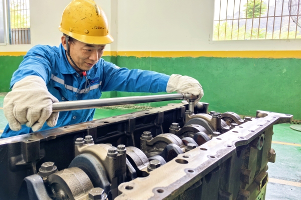 礦山分廠工程機械維修工馮勝元全神貫注地操控著扭力扳手,對TR50礦車發動機連桿螺栓實施精準施力。這項看似簡單的預緊作業,實則是保障動力核心穩定運轉的關鍵工序,凝結著延長設備服役周期的匠心。(胡萬禹/攝)