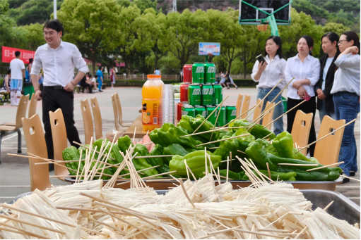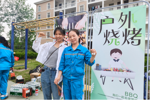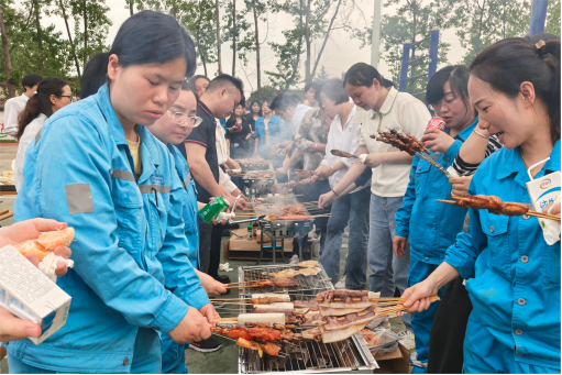 4月29日下午,職工活動中心外的羽毛球場成了歡樂海洋。不銹鋼托盤里,秘制雞翅、孜然牛肉、羊肉串、魷魚、五花肉串堆得冒尖,花菜、青椒、金針菇整齊碼放,等待炭火炙烤。炭火噼啪作響,油脂滴落在火焰上,騰起陣陣帶著孜然香氣的白煙。裝運分廠的錢小紅左右翻轉,將烤得金黃的肉串分給周圍的年輕人:“嘗嘗我這手藝,保準比外頭攤子上的還香!”