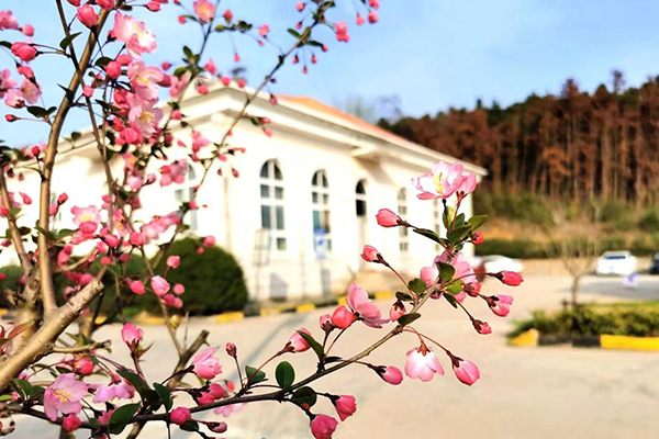 “無人會得東風意,春色都將付海棠”。在食堂門前,一株株海棠嬌艷似少女的笑靨,微風輕拂,花朵如粉蝶般飄舞。