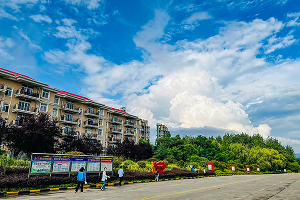 藍天白云悠然鋪展,公司萬噸線宿舍樓與蔥郁綠植相映成趣,行人于開闊道路間漫步,在晴朗日光里勾勒出一幅閑適生動的生活畫卷。