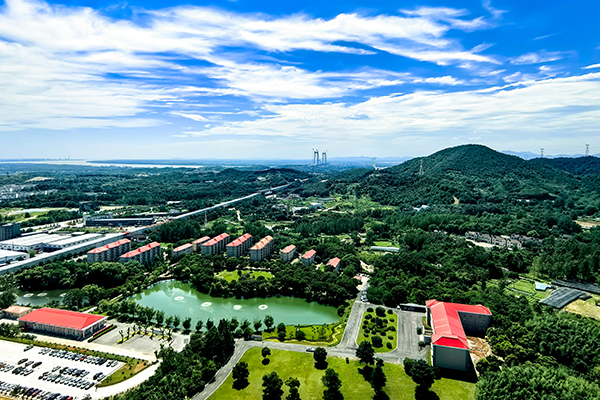 藍天白云下,蔥郁樹木錯落點綴著如茵綠草,遠處的辦公樓靜立其間,連綿青山為幕,勾勒出一幅明媚清新的自然景致。