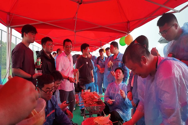當架子鼓的镲片被雨珠砸出金屬顫音,當貝斯線在潮濕空氣中嗡嗡震顫,這場音樂節從開場就“野”到離譜!主唱濕發甩出水花,唱著《稻香》的歌詞:“笑一個吧,功成名就不是目的,讓自己快樂快樂這才叫做意義……”臺下觀眾齊聲合唱,手機閃光燈在雨簾中連成星海。音樂節另一大戰場——燒烤區同樣“戰況激烈”。炭火在雨中倔強燃燒,鐵簽上的肉串滋滋冒油,和雨滴在油鍋里炸開的噼啪聲組成“吃貨交響曲”。00后員工小張一邊翻烤雞翅,一邊調侃:“這比窩在宿舍打游戲帶勁多了!真希望天天有這種活動。”有的員工更是放飛自我,舉著羊肉串當麥克風,即興高歌,氛圍一浪更比一浪高。